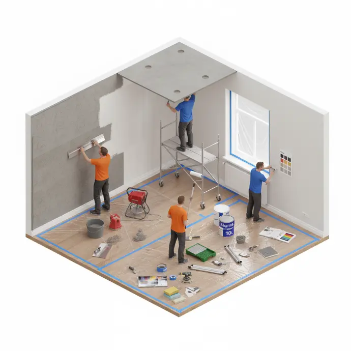 Schuren, plamuren en repareren van scheuren. Afdekken van meubels en vloeren. Grondverf waar nodig.
